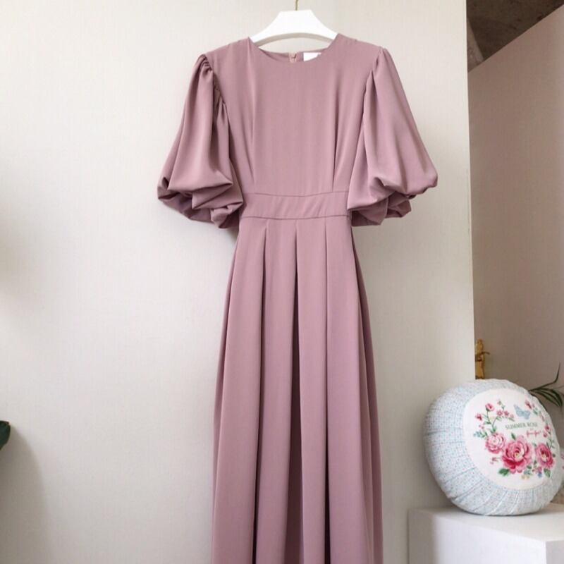 スタンダードラウンドネックバンドプリーツウェストロングドレス ランタンスリーブ レトロ Oネック ICC_レディース0696203