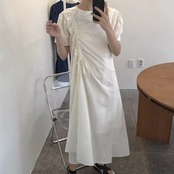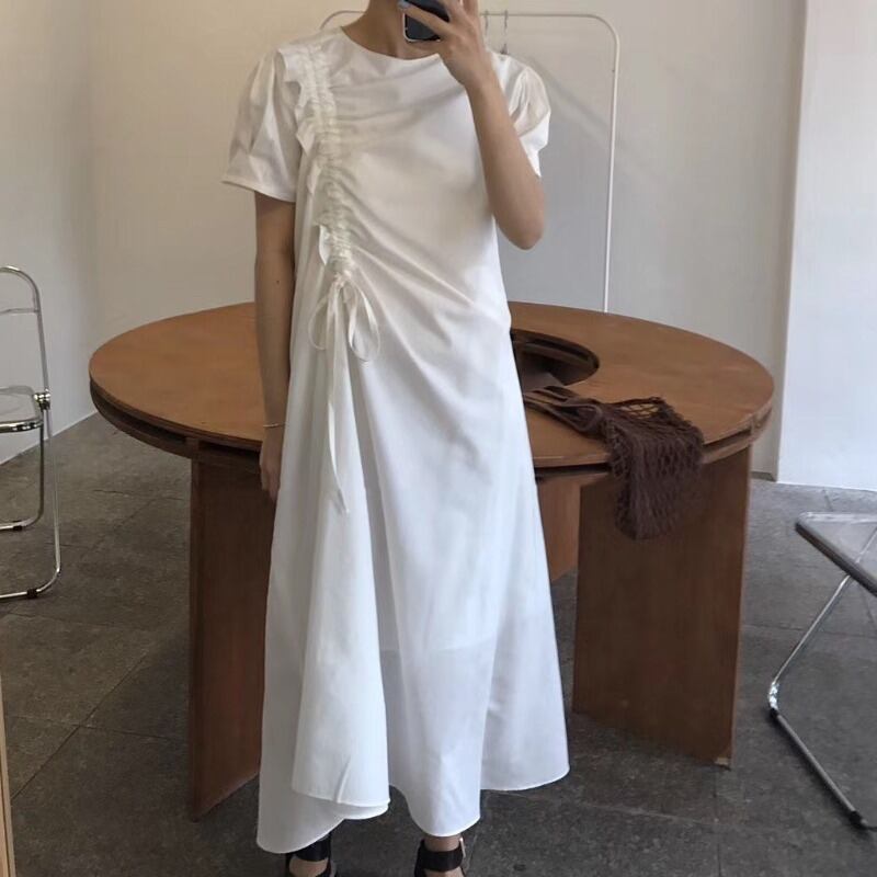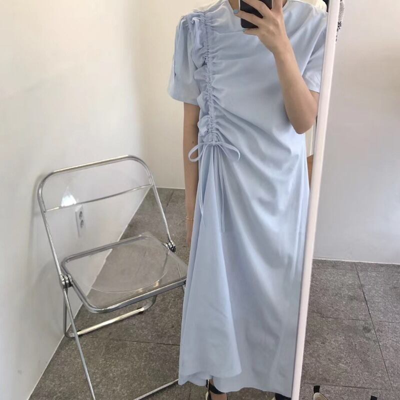 ブルーラウンドネックギャザールーズドレス ロングスカート Oネック ICC_レディース8235226