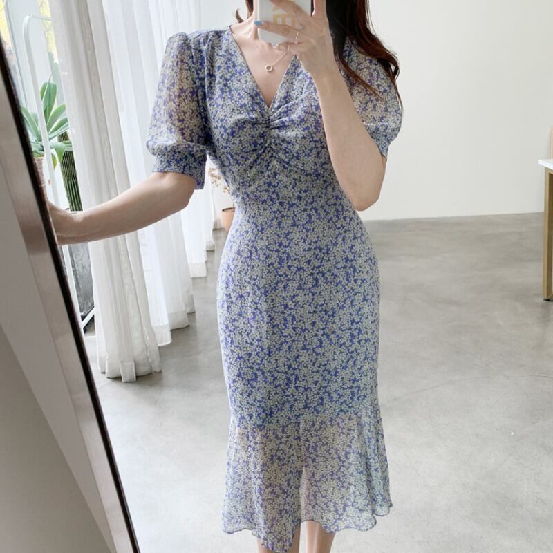 スタンダードVネック薄手ウェストシフォンフローラルドレス ロングスカート レトロ 花柄 ICC_レディース7727496