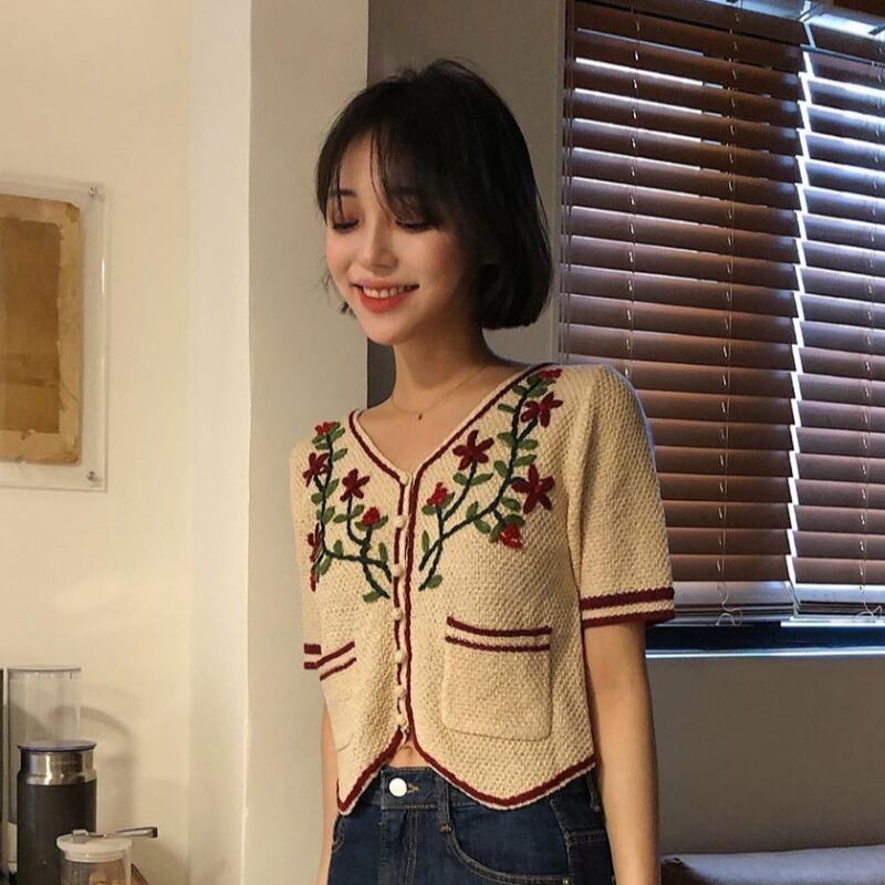 サマースタンダードFlowerデザイン 薄手Vネック刺繍シャツ 半袖スリーブポケットニットカーディガンレディース ショート レトロ ハーフスリーブ 夏物 フラワーデザイン ICC_レディース2585980