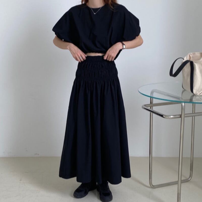 サマープリーツスリーブルーズショートトップス ストレッチスカート レッド エラスティック 伸縮 夏物 ICC_レディース6413793