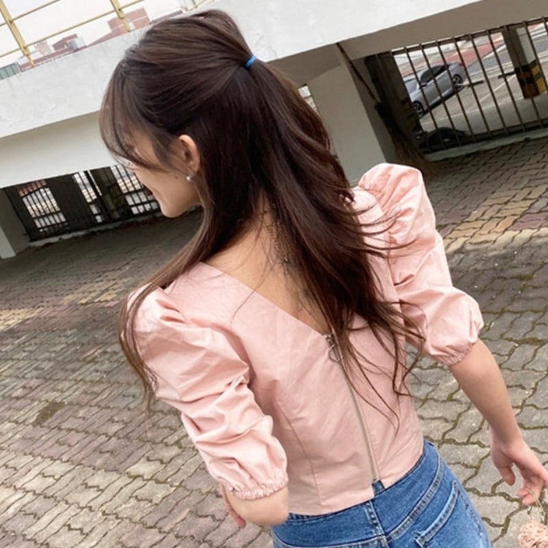 スプリングサマーバックジッパー薄手スタンダードカラーショートスリーブシャツ レトロ 春物 夏物 スクウェア ICC_レディース5413085
