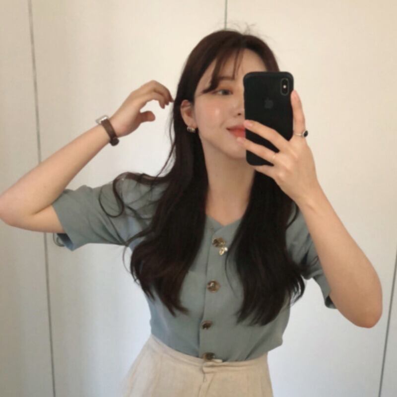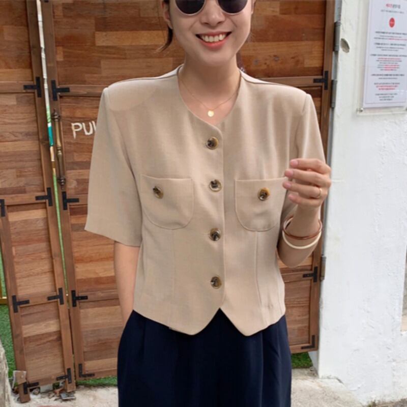 サマースタンダードブルーホワイトポケット薄手ショートシャツ レディース レトロ 夏物 ICC_レディース2410191