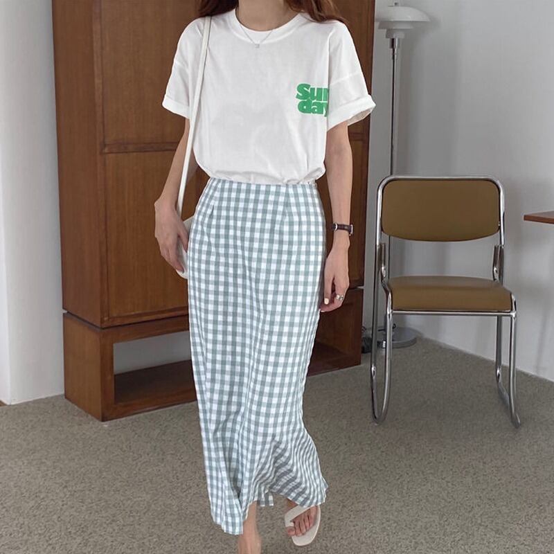 サマープリントTシャツ ハイウェストウェスト格子柄スカート ロング ピンク 夏物 ICC_レディース7956305