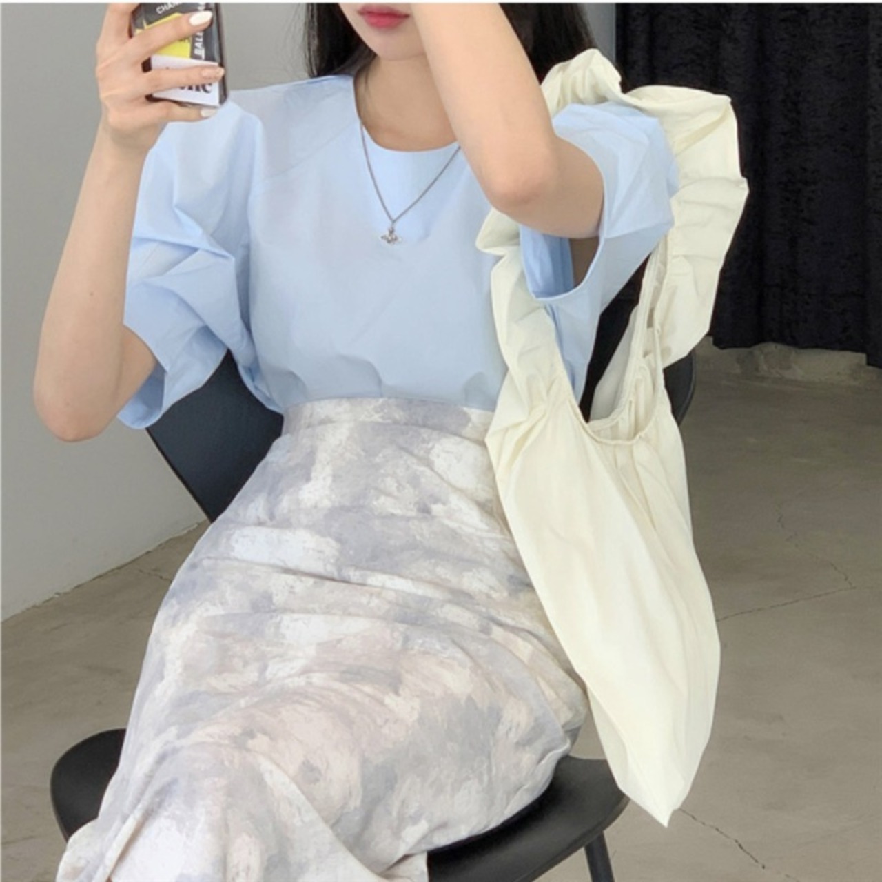 ブルーラウンドネックスリーブシャツ ハイウェストウェスト薄手プリントスカート ロング Oネック ICC_レディース0582243
