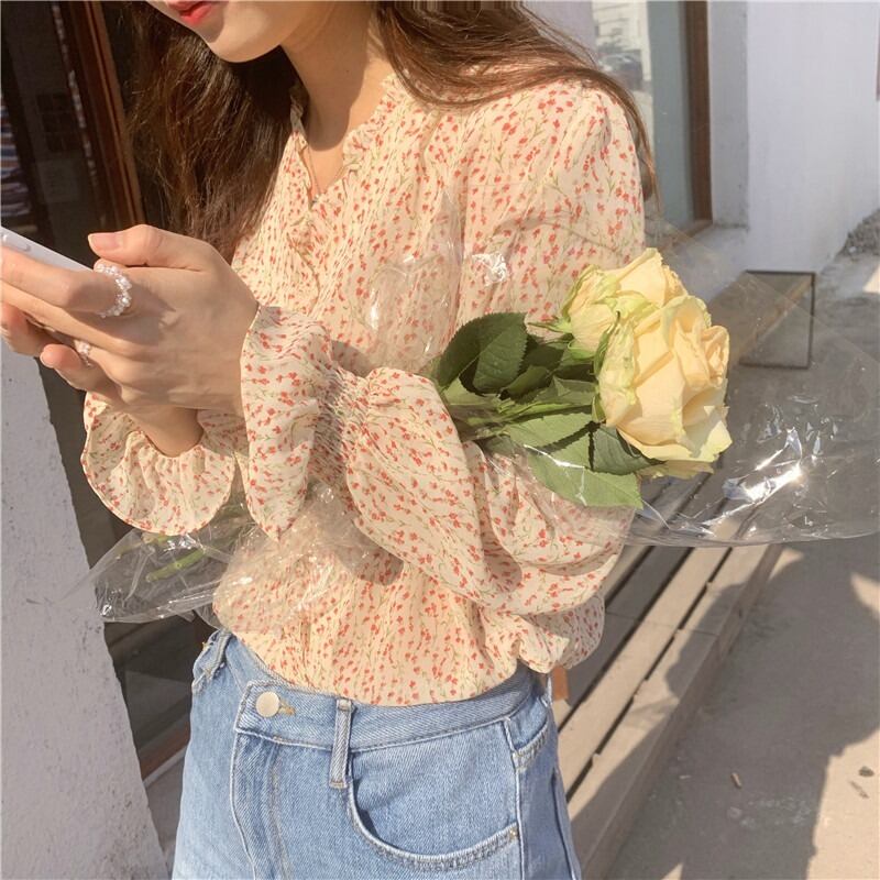 スタンダードVネックフローラルシフォンシャツ スプリングルーズ レトロ 春物 花柄 ICC_レディース9601668