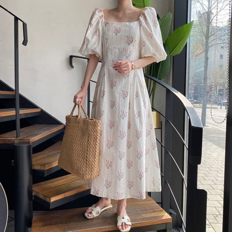 サマーロングカラーフローラルスカート スリーブウェストドレス レディース 夏物 花柄 スクウェア ICC_レディース7414969