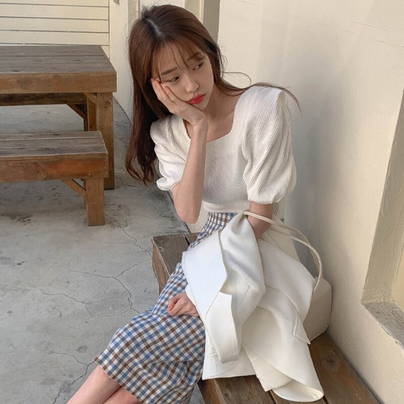 サマースタンダードカラーソリッド Tシャツ ハイウェストウェストスカート レトロ 夏物 ソリッドカラー スクウェア ICC_レディース4000498