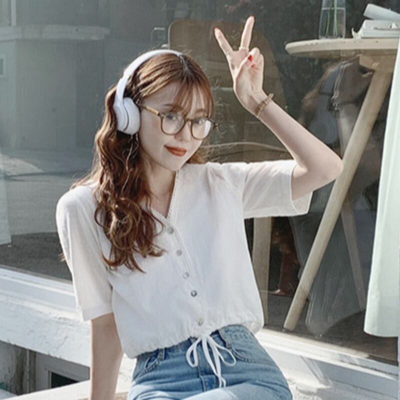 レースギャザーショートシャツ サマーソリッド カラーカジュアル コルセット 夏物 ソリッドカラー ステッチ ICC_レディース7606862