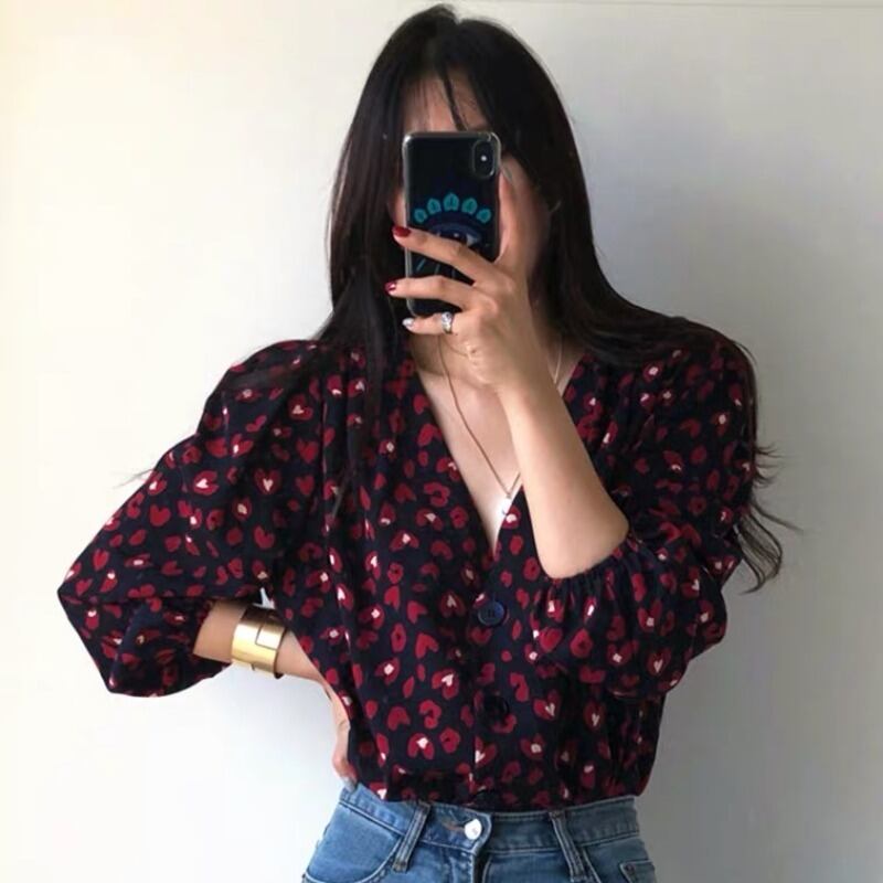 スプリングサマースタンダードプリントVネックルーズスリーブシャツ レディース レトロ 春物 夏物 ICC_レディース5053741
