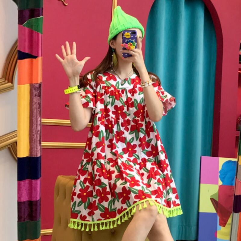 スタイルFlowerデザイン ラウンドネックバックルーズショートドレス レース Oネック レースアップ フラワーデザイン ICC_レディース5452479