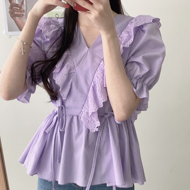 サマースリーブシャツ スタンダードショートウェストVネック半袖 レトロ ハーフスリーブ 夏物 パープル ICC_レディース9147016
