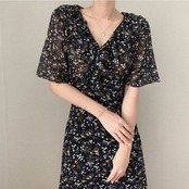 Vネックウェストシフォンフローラルドレス レディース レース 花柄 レースアップ ステッチ ICC_レディース5529394