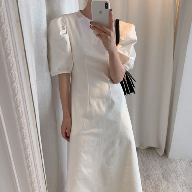 サマースタンダードラウンドネックスリーブウェストスリム薄手ソリッド カラードレス ロングスカート レトロ 夏物 Oネック ソリッドカラー ICC_レディース8732348