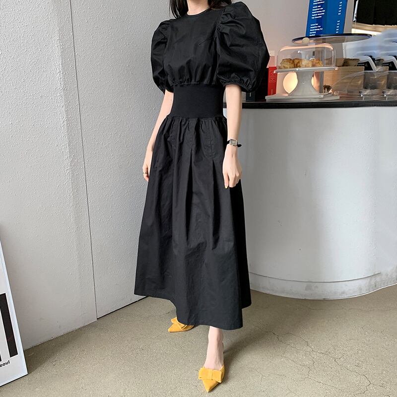 ラウンドネックルーズラッフルハイウェストウェストスリーブドレス ロングスカート エレガント Oネック ICC_レディース8343291