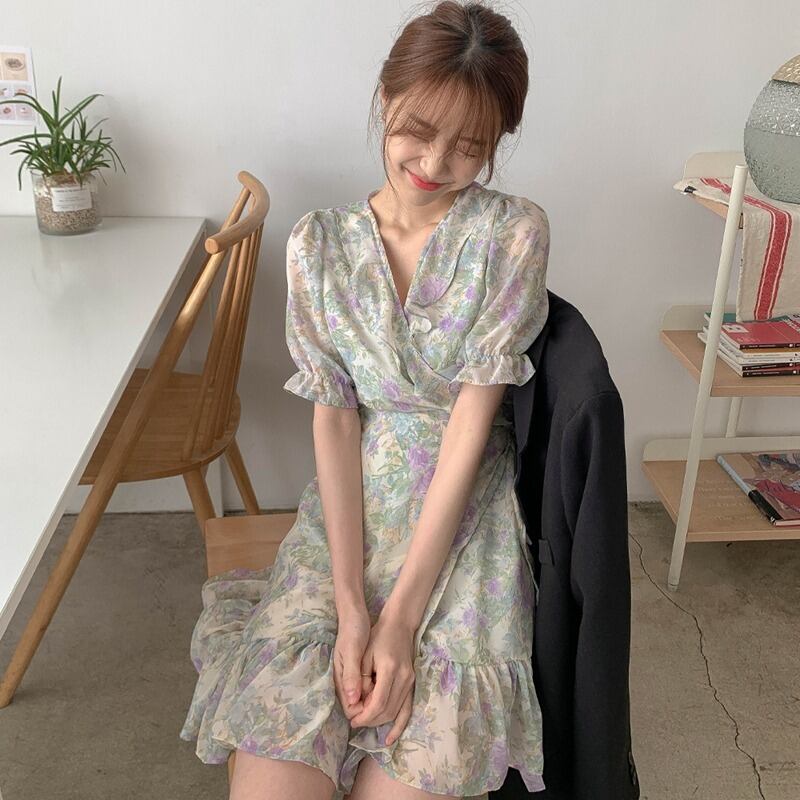 フローラルVネックレースシフォンウェストワンピースドレス 花柄 ICC_レディース1283362