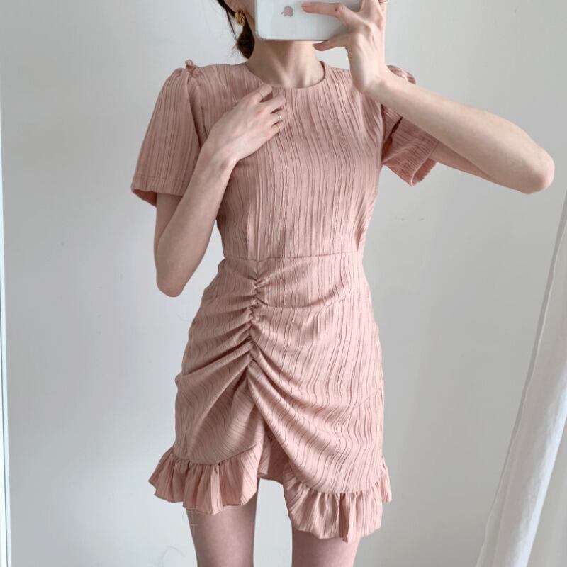 スプリングサマーハイウェストウェスト薄手プリーツドレス コットン エラスティック 伸縮 春物 夏物 ICC_レディース2528504