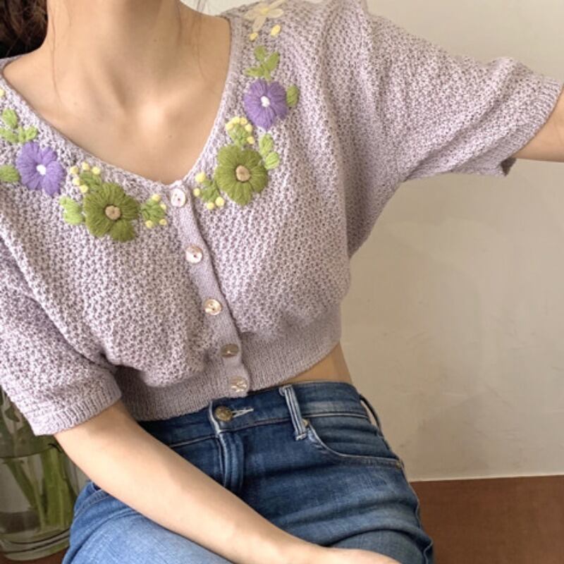 サマースタンダード刺繍ニットセーター 薄手カーディガンラインジャケット シャツ レトロ 夏物 ICC_レディース7064672
