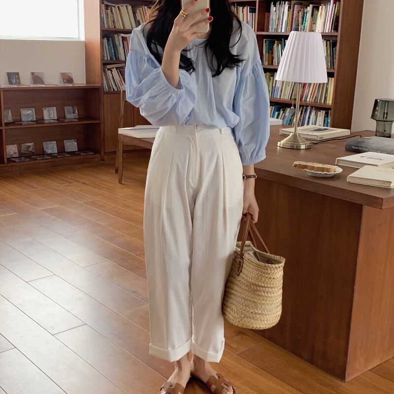色:青いシャツ,ホワイトパンツS,ホワイトパンツM