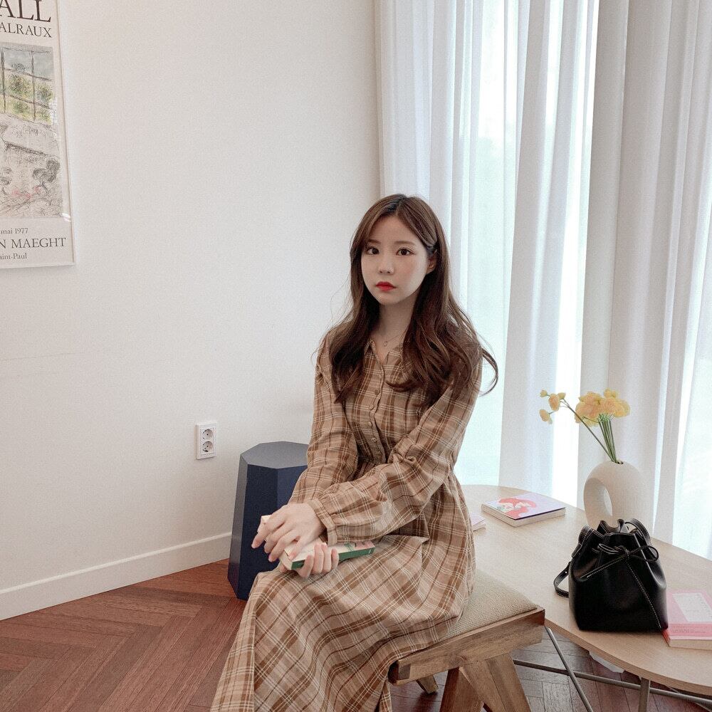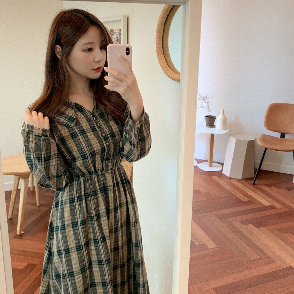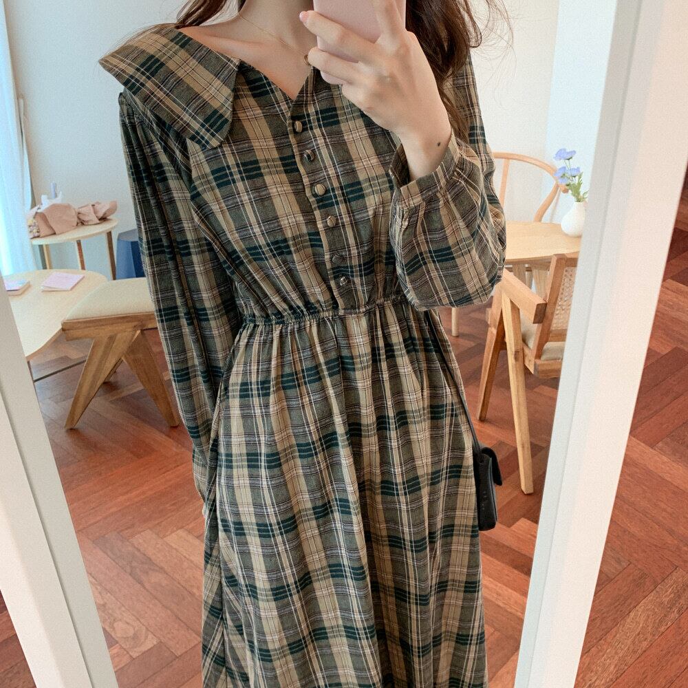 スプリングオータムスタンダード格子柄スカート ロングウェストドレス レトロ 春物 秋物 フラワーデザイン 左左右右4152615