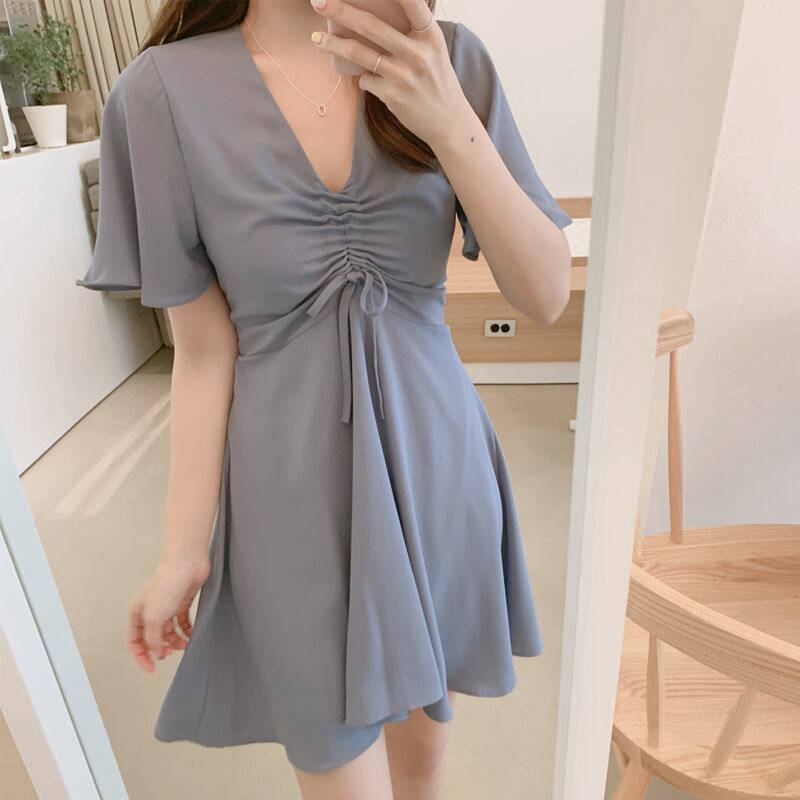 2019夏レトロプリーツニッチVネックフェアリースカートシック優しいリトルスリミングAラインドレス サマー 夏物 左左右右_复古定制4141505
