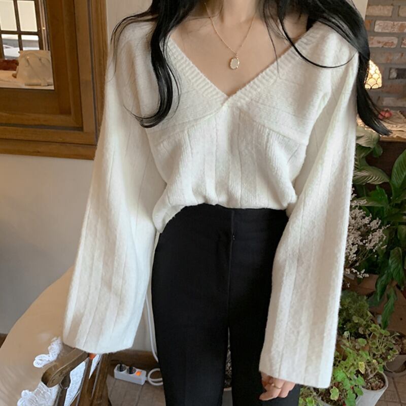 スプリングVネックシャツ 薄手ルーズスリーブプルオーバー セーター 春物 ICC_レディース5270134