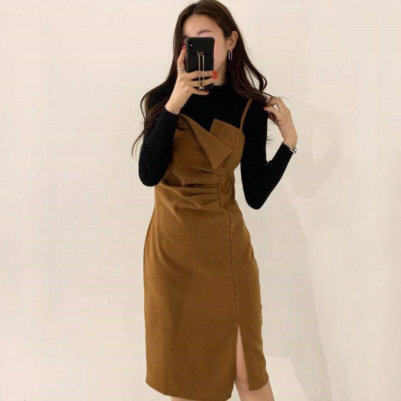 色:黒いセーター,カーディガンドレス,アプリコットドレス
