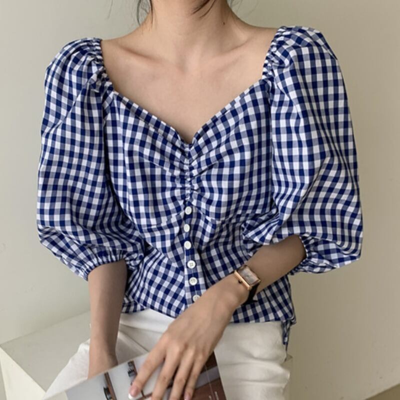 サマーVネックプリーツルーズスリーブ格子柄シャツ レディース 夏物 ICC_レディース9380430