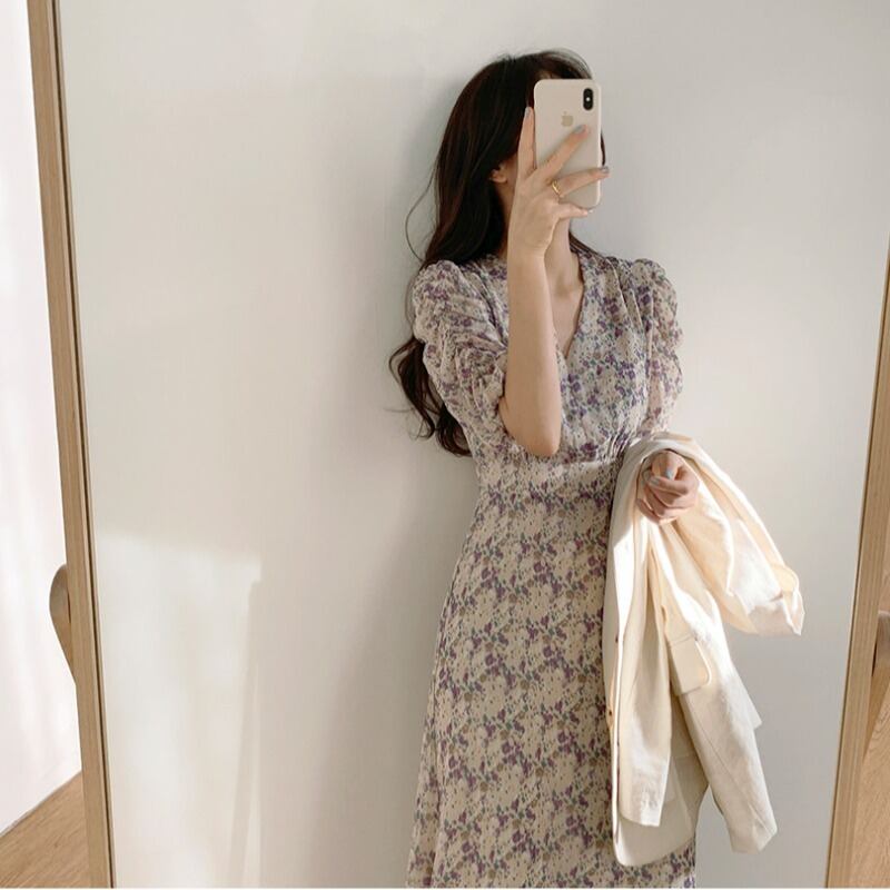 スタンダードフローラルロングドレス サマーVネックスリーブウェスト レトロ 夏物 花柄 ICC_レディース5863169