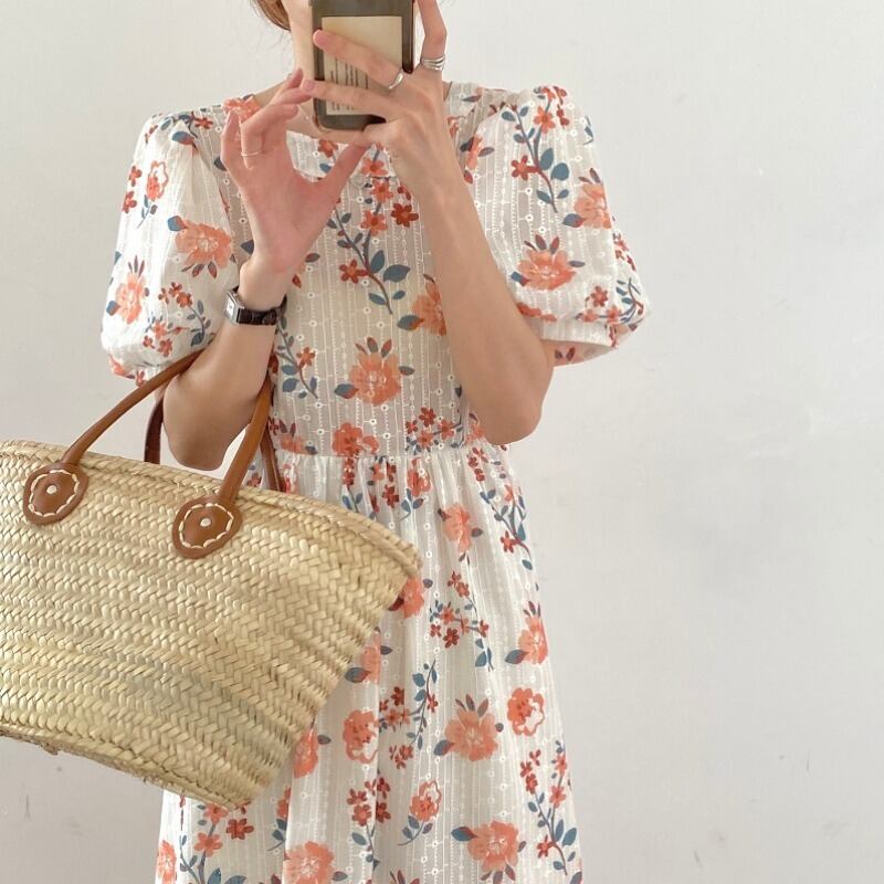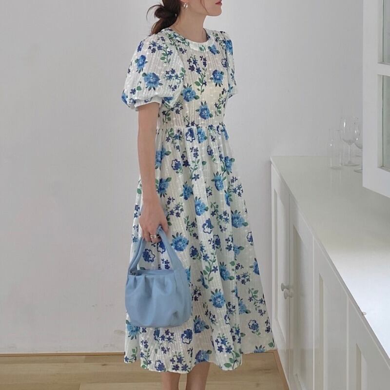 サマーホルターラウンドネックFlowerデザイン プリント柄プリーツハイウェストウェストドレス スカート 夏物 Oネック フラワーデザイン ICC_レディース7068238