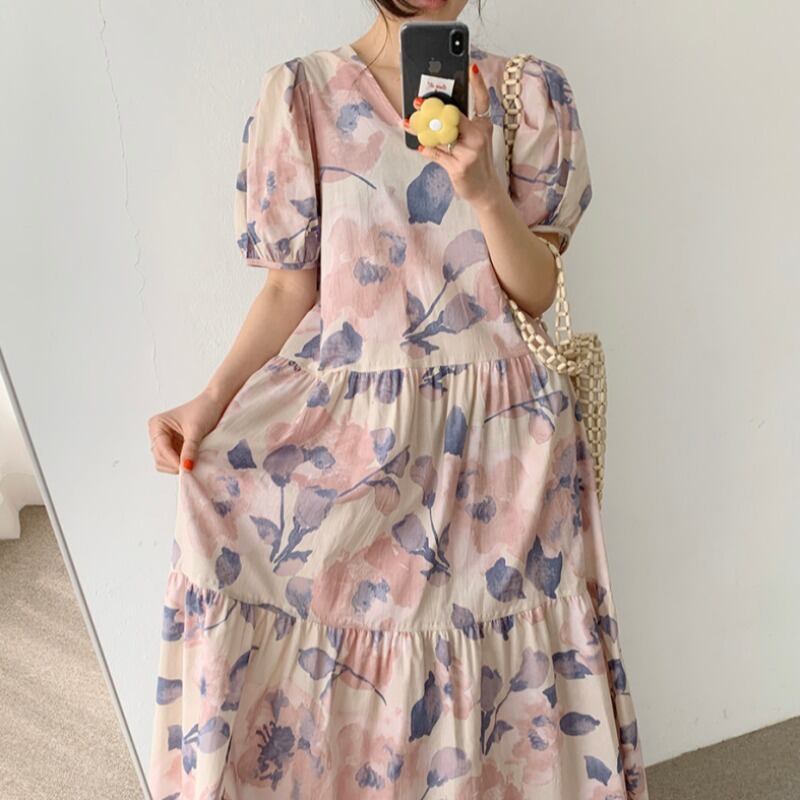 サマーVネック薄手ロングスカート プリントドレス 夏物 ICC_レディース0106100
