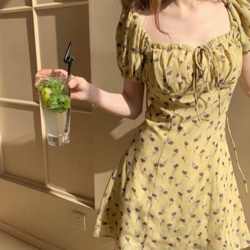 サマースタンダードフローラルカラードレス ショートスカート 薄手 レトロ 夏物 花柄 スクウェア ICC_レディース8919613