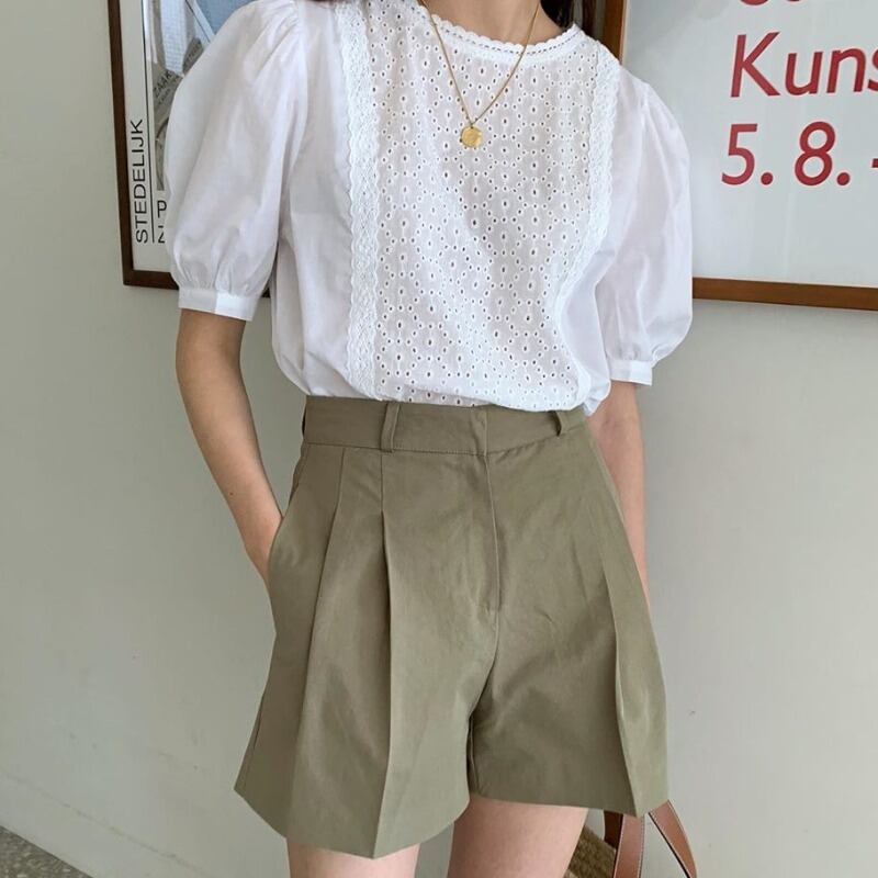 サマーラウンドネック刺繍Flowerデザイン スリーブシャツ ハイウェストウェストカジュアルショーツ 夏物 ブルマー Oネック フラワーデザイン ICC_レディース6800948