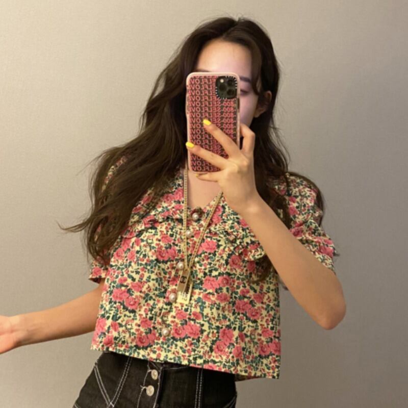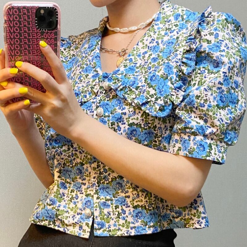 スタンダードボタンルーズスリーブフローラルシャツ トップス レトロ 花柄 ICC_レディース2836993
