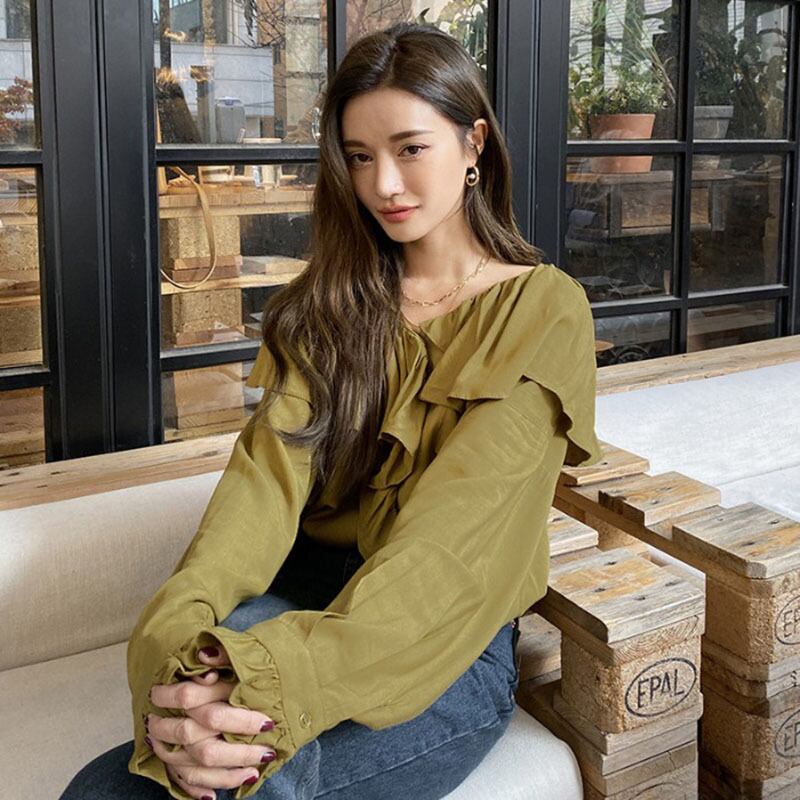 グリーンホワイトカラーシャツ ルーズスリーブ ICC_レディース7862018