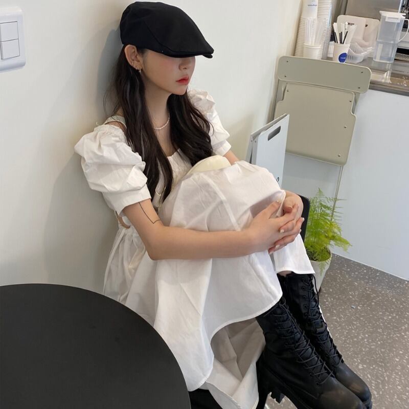 スタンダードカラープリーツストラップ サイドルーズスリーブドレス レディース レトロ スクウェア ICC_レディース0460322