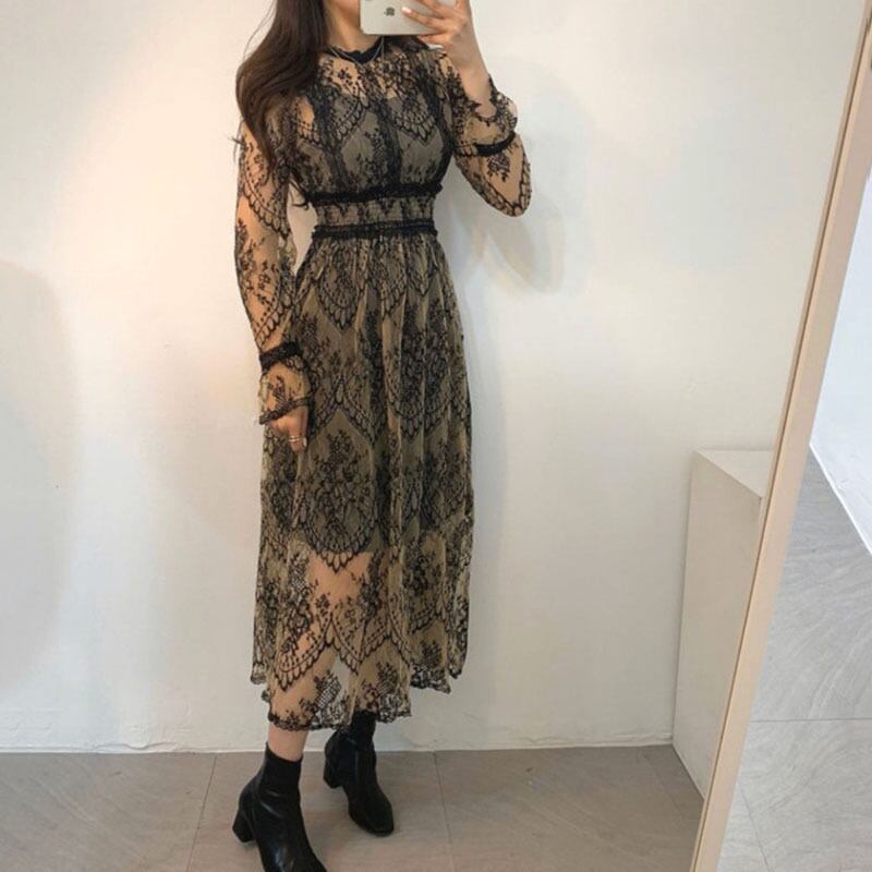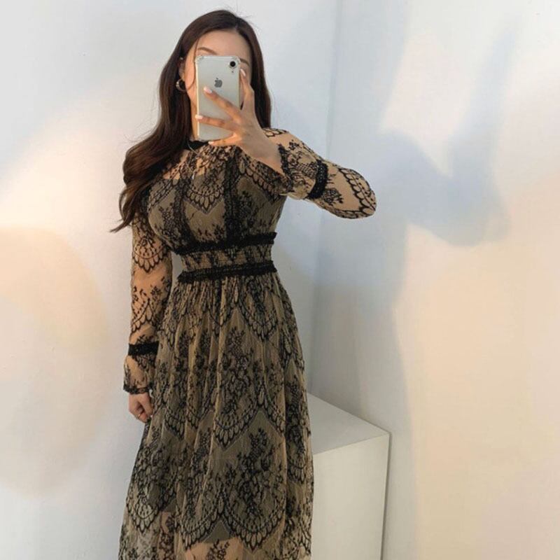 ドレス スタンダードラウンドネックFlowerデザイン レーススリムハイウェストウェスト ロング レトロ エレガント Oネック フラワーデザイン ICC_レディース5643876
