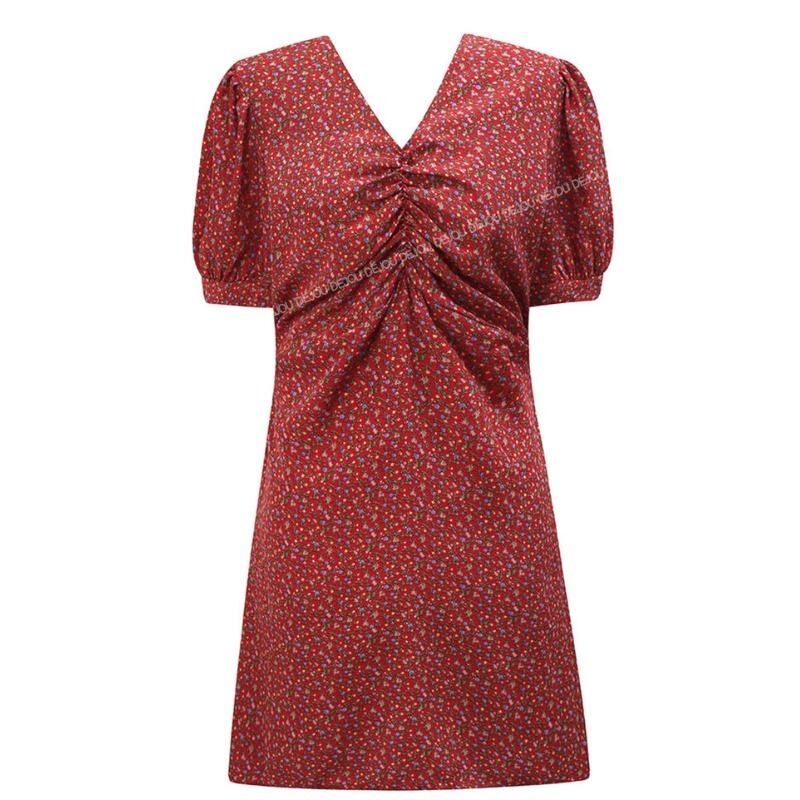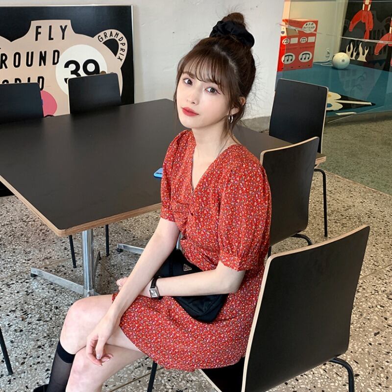シフォンフローラルドレス Vネックウェスト薄手スタンダードスリーブショートサマー レトロ 夏物 花柄 フラワーデザイン ICC_レディース5102054