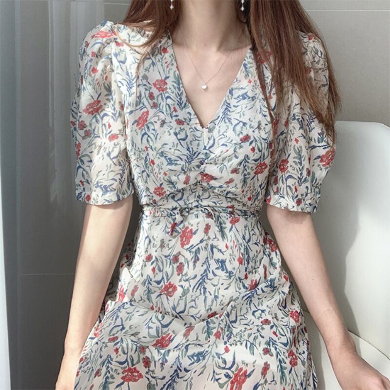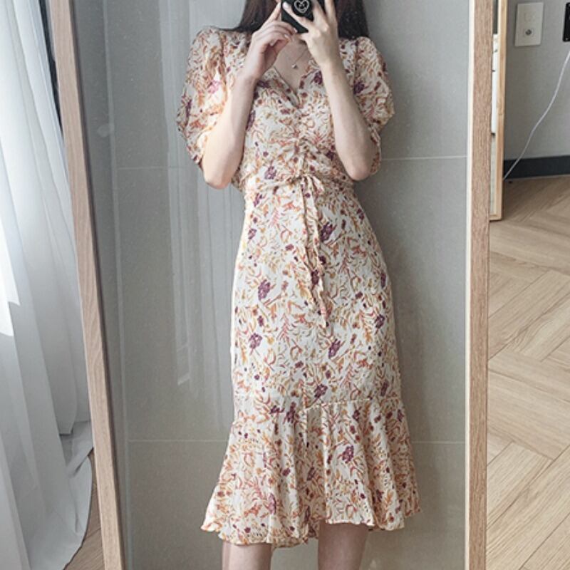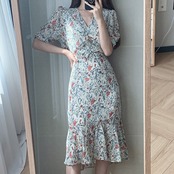 サマースカート ウェストフローラル半袖スリーブシフォンドレス ショート ハーフスリーブ 夏物 花柄 フラワーデザイン ICC_レディース4584862