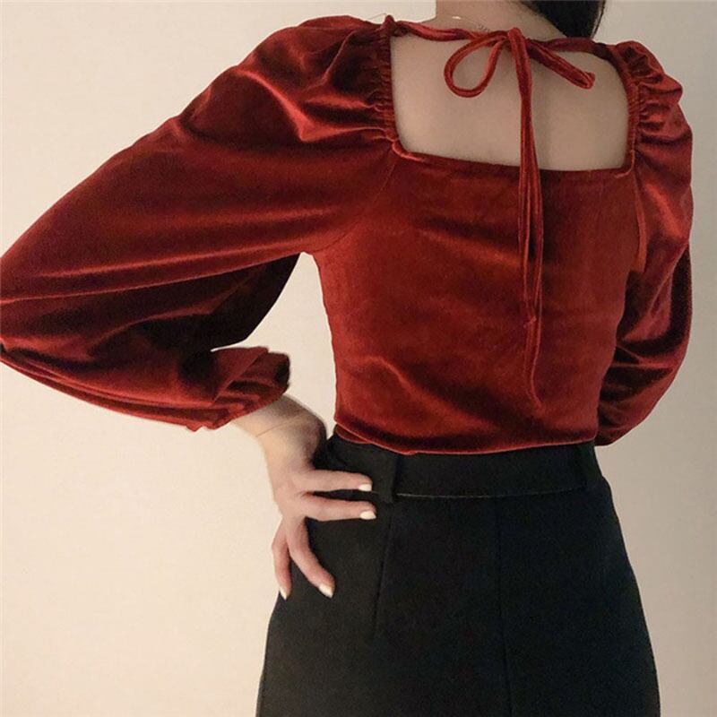スタイルスタンダードホワイトカラープリーツバック長袖スリーブベルベットシャツ ロング レトロ スクウェア ICC_レディース3690151