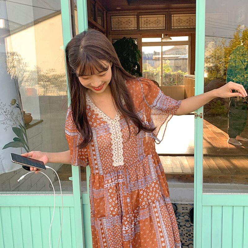 サマースタイルスタンダードルーズシフォンドレス ロングスカート レトロ 夏物 ICC_レディース2852146