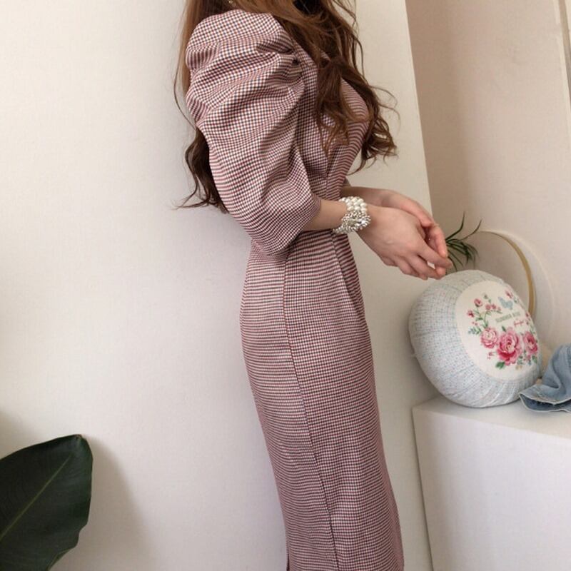サマーVネックカラー格子柄スリムウェストスリーブドレス レディース 夏物 ICC_レディース0361547