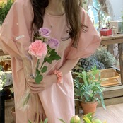 サマーラウンドネックルーズダブルポケットロングストライプドレス ピンク ランタンスリーブ 夏物 Oネック ICC_レディース6229275