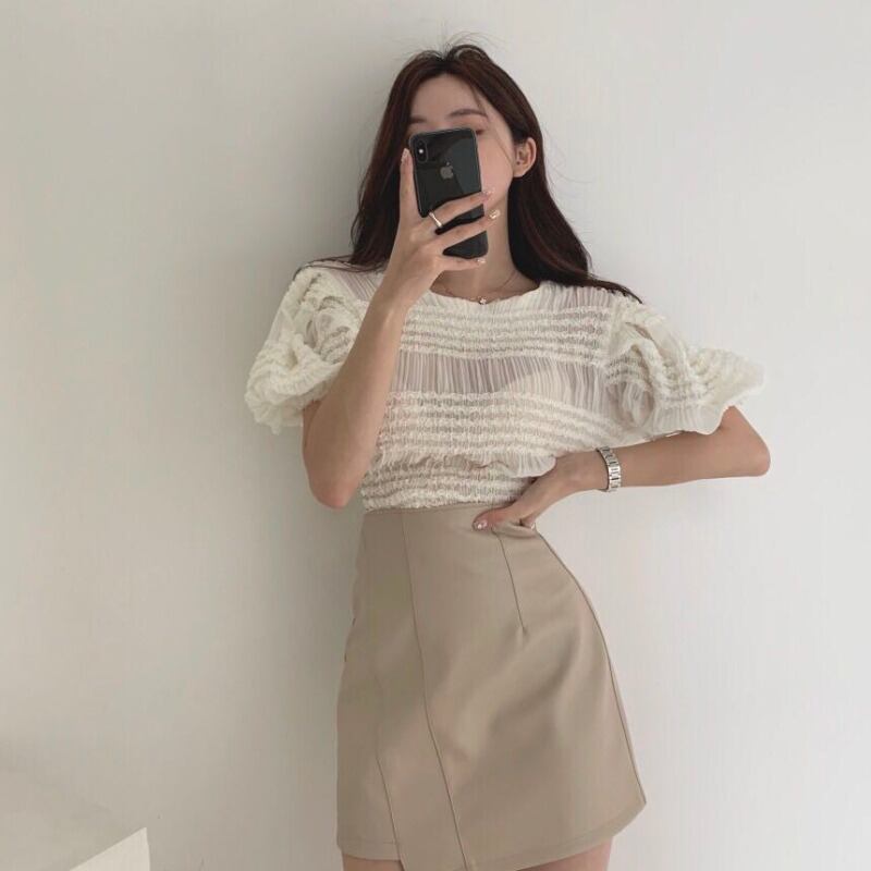 プリーツラウンドネックシャツ スタンダードハイウェストウェスト薄手スカート レディース レトロ 大人ガーリー スウィート キュート カジュアル Oネック ICC_レディース6955345