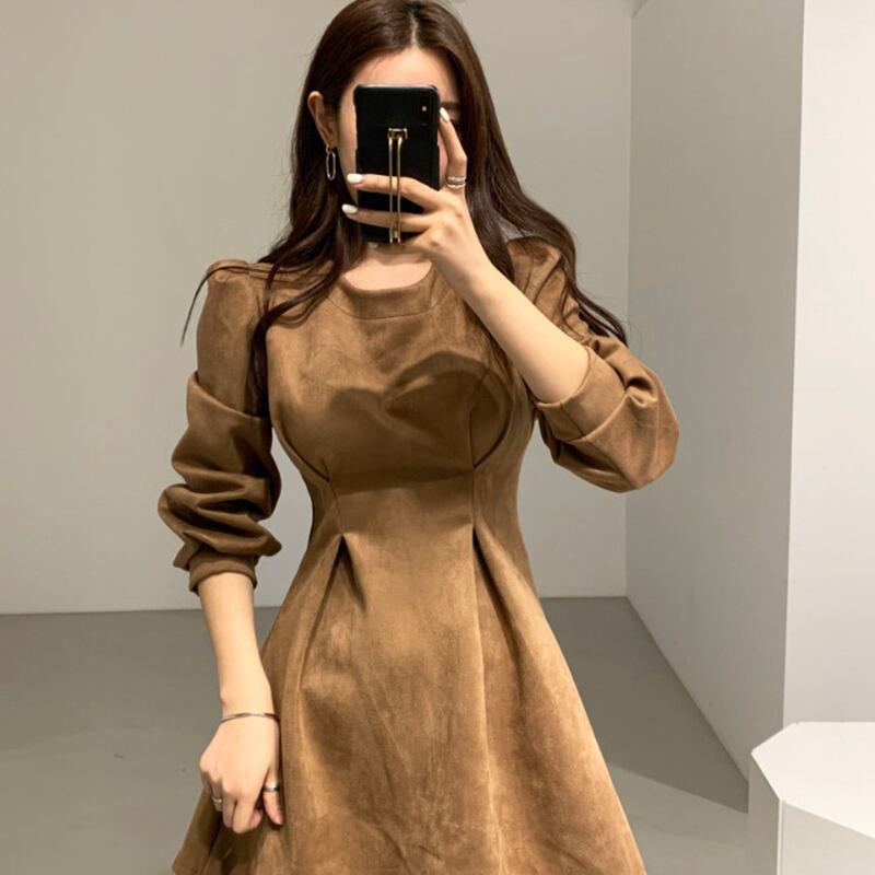 スタンダードラウンドネックソリッド カラープリーツウェストドレス レトロ Oネック ソリッドカラー ICC_レディース6421208