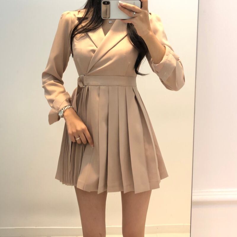 ドレス 薄手カラーソリッド スタンダードプリーツショート レトロ ソリッドカラー ICC_レディース5168137