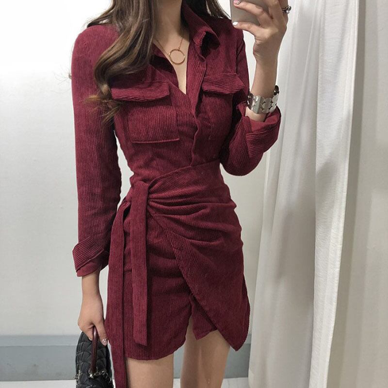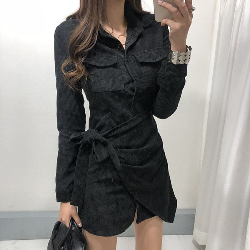 スタンダードコーデュロイシャツ ドレス オータムウィンタースカート スリム レトロ レース 秋物 冬物 レースアップ ICC_レディース2827584