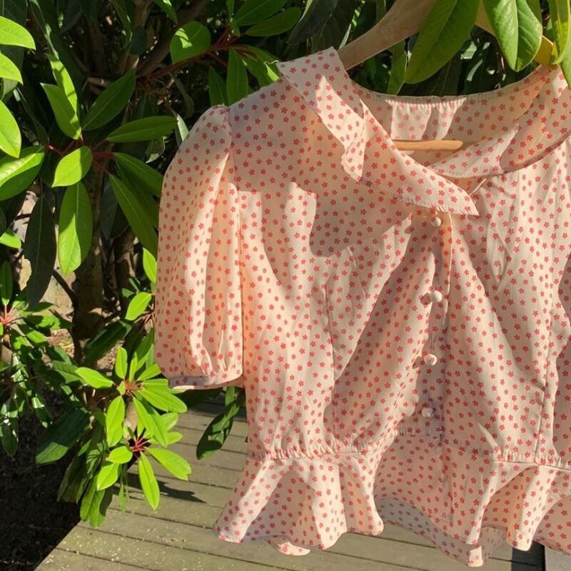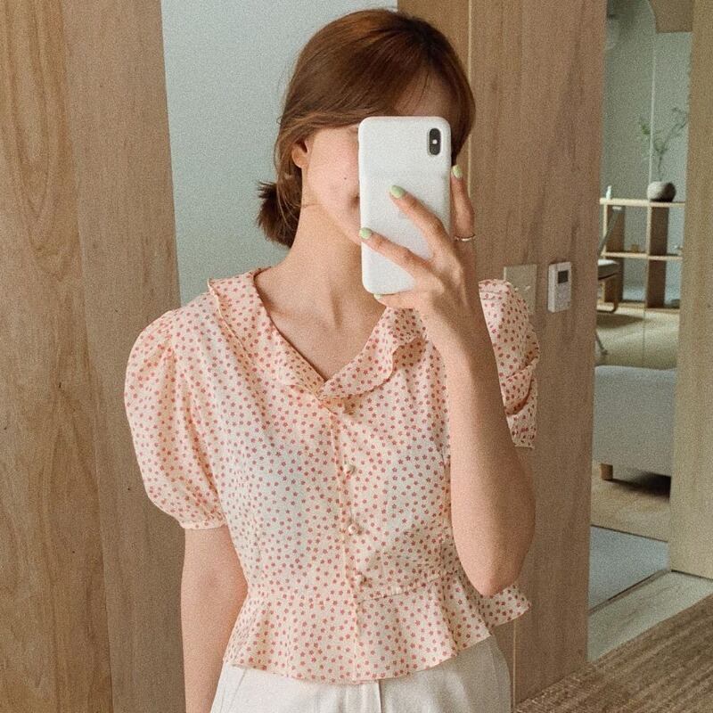 サマーFlowerデザイン フローラルトップス ショートスタンダードVネックシャツ レトロ 夏物 花柄 フラワーデザイン ICC_レディース7195310