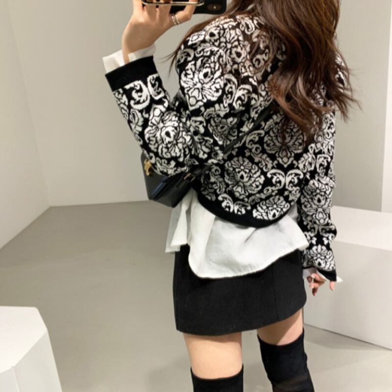スタンダードプリントカラーラウンドネックニットセーター ハイウェストウェストAラインショートスカート レトロ Oネック ICC_レディース9953671