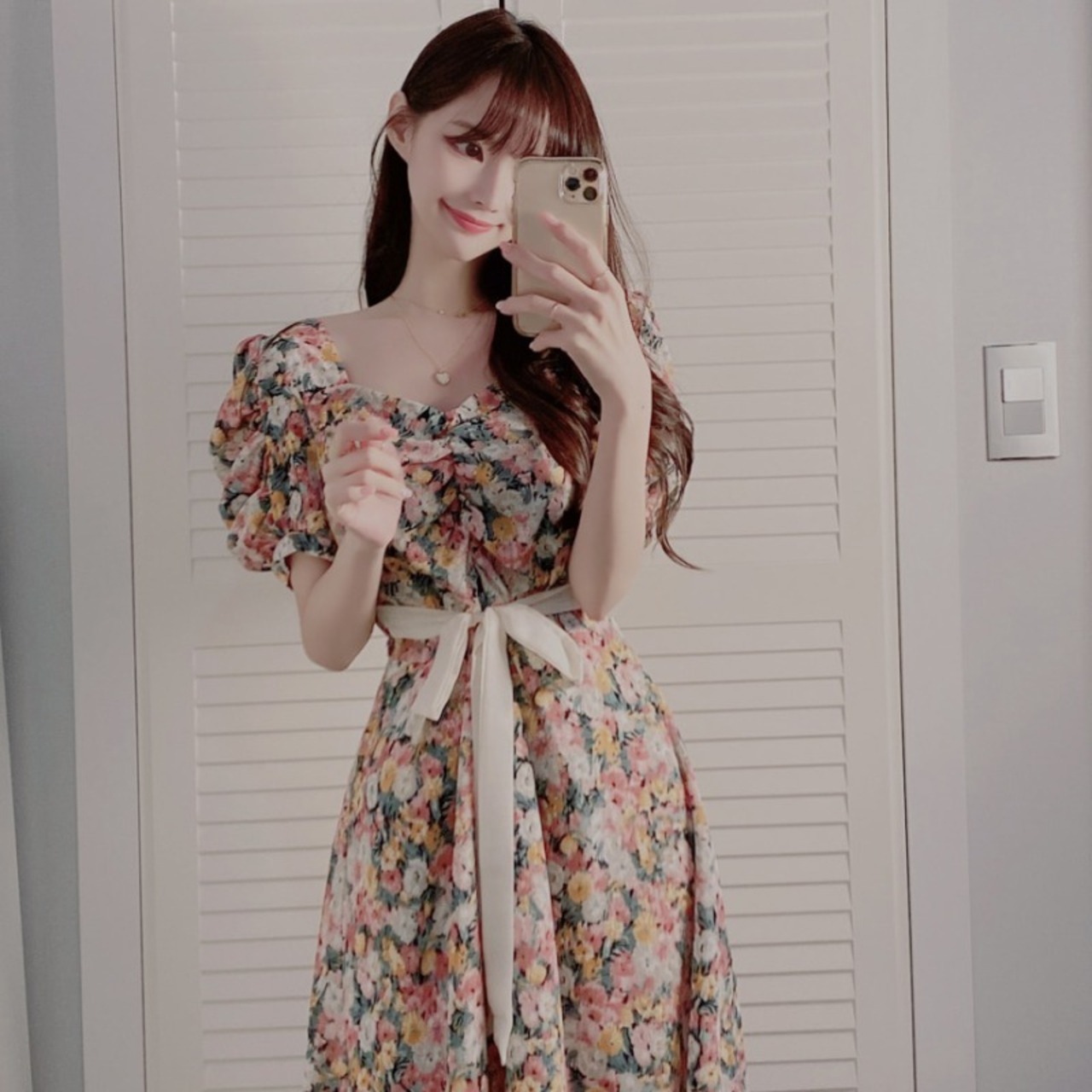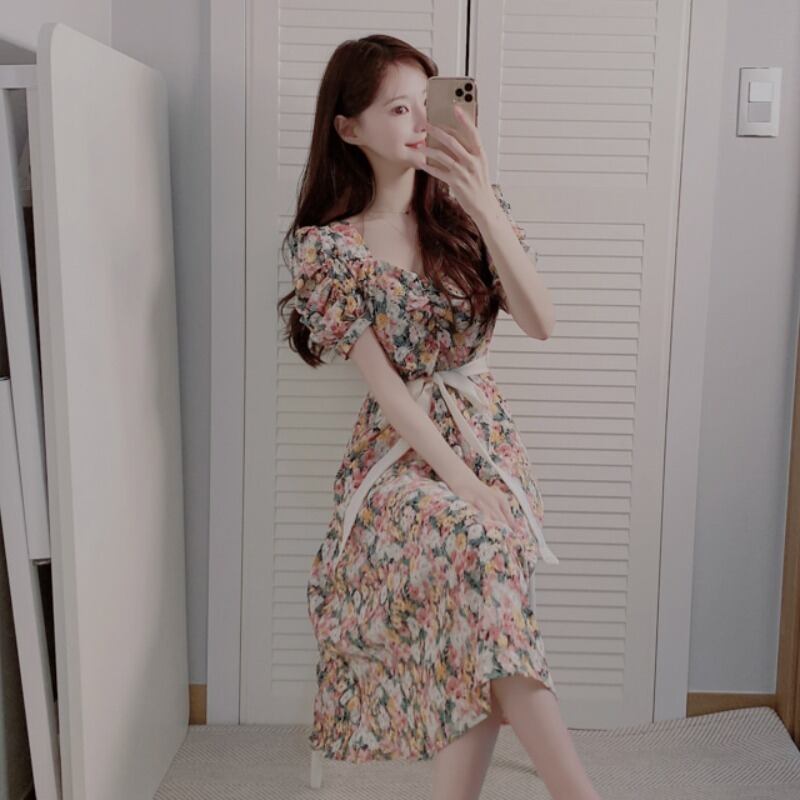 スタンダードスリーブドレス フローラルVネックウェストサマー レトロ 夏物 花柄 ICC_レディース9698032